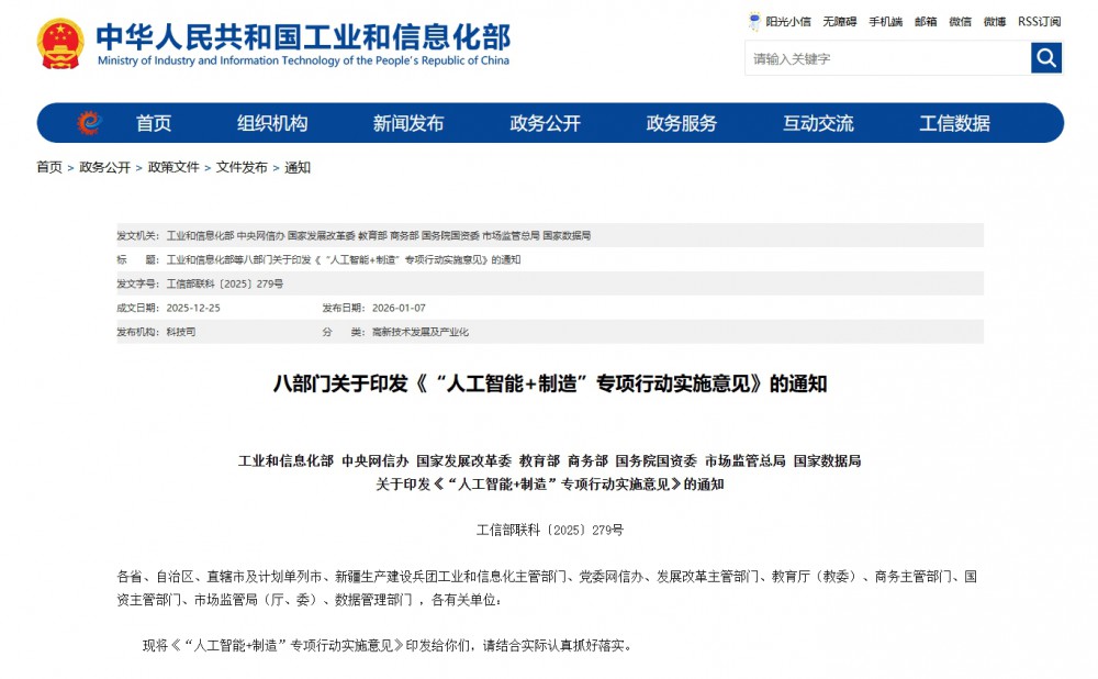 工信部等八部门联合印发《“人工智能+制造”专项行动实施意见》
